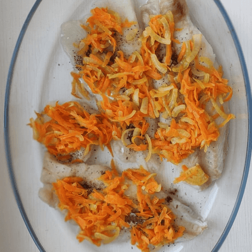 Готовую зажарку разложить на каждое филе рыбы.