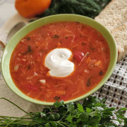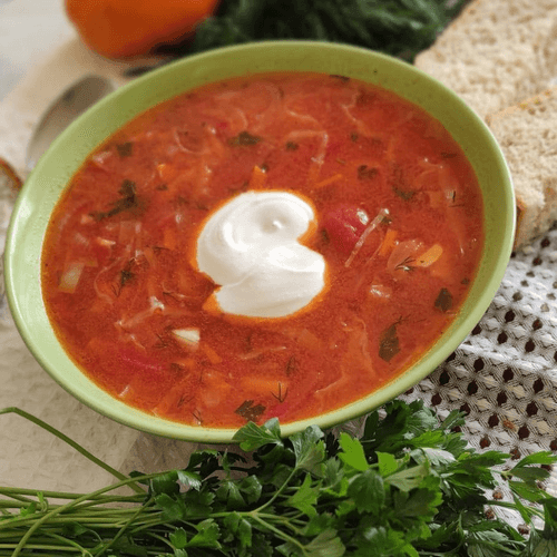 Кубанский борщ — это яркое и ароматное блюдо русской кухни, пропитанное теплом южных регионов. Его основа — наваристый говяжий бульон, который соединяется с богатым букетом овощей: сладковатой свеклой, нежной капустой и ароматной зеленью. Тонкая кислинка помидоров и легкая чесночная пряность придают борщу насыщенный и сбалансированный вкус. Зажарка из моркови, лука и свеклы делает бульон густым и глубоким по цвету. Кубанский борщ отличается своим богатым составом и нежным, слегка сладковатым вкусом. Его подают горячим, обязательно с ложкой сметаны, которая смягчает насыщенность бульона. Это блюдо не просто питательное, но и согревающее, прекрасно подходит для семейных обедов и праздничных застолий, напоминая о традициях русского гостеприимства.
