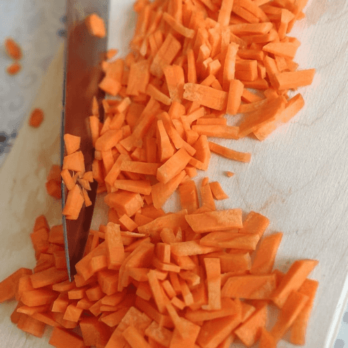 Небольшими полосками нарезать морковь.