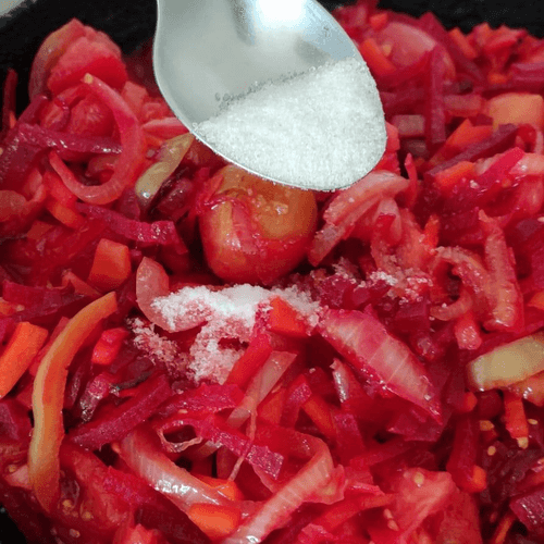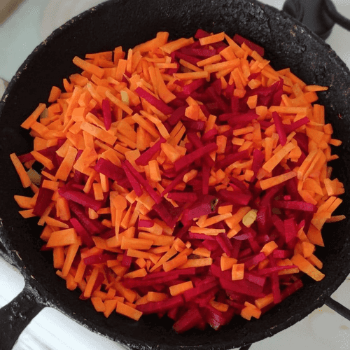 Подготовить зажарку. Разогреть хорошо сковороду с подсолнечным маслом и соединить свеклу, лук и морковь. Обжарить 5–7 минут, постоянно перемешивая.