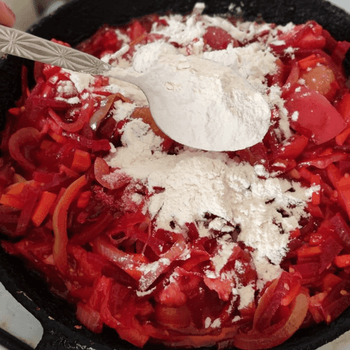 Добавить 1 столовую ложку муки, перемешать и тушить еще 5 минут.