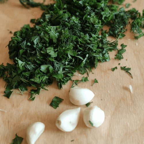 Измельчить укроп, петрушку и чеснок.