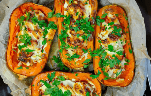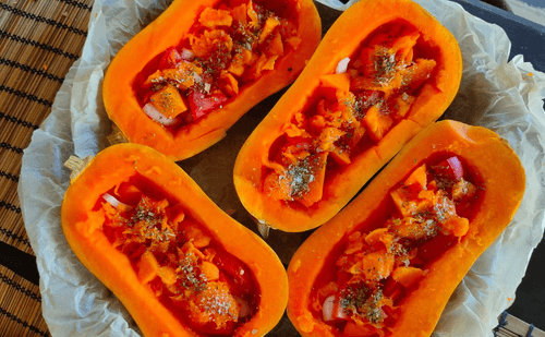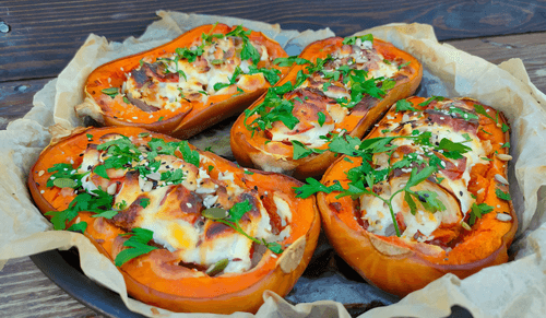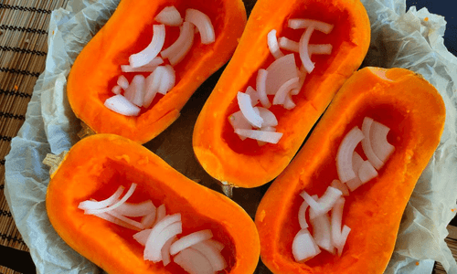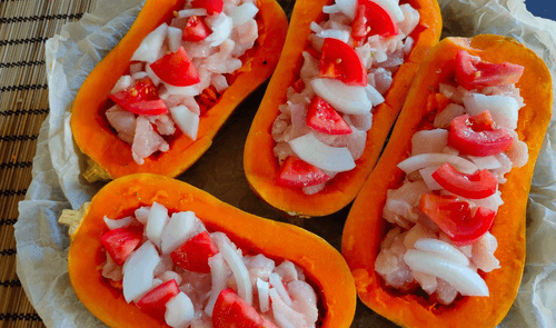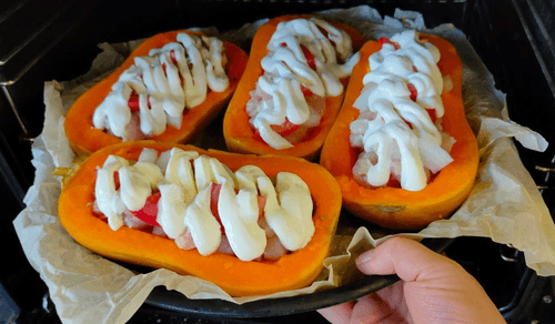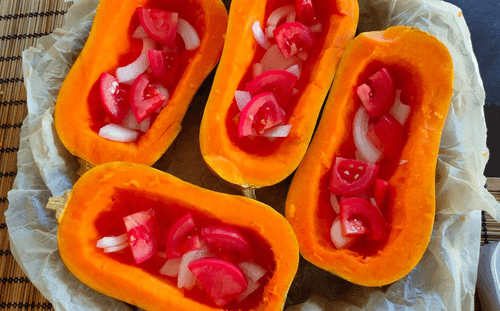 Сверху на бумагу выложить опустошенные половинки тыквы.