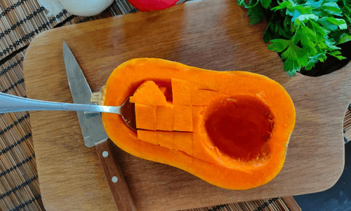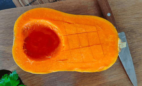 Для более простого и быстрого способа вынуть внутреннюю часть мякоти, на каждой половинке сделать надрезы по диагонали, отступив немного от края.