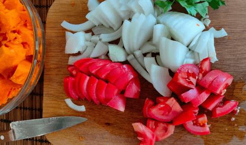 Лук и помидор нарезать небольшими кусочками, например по четверть кольца.