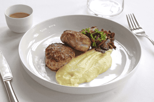 Выложить на каждую тарелку по 2 котлеты, картофельное пюре (если оно успело остыть, слегка его подогреть) и гарнир из грибов. Полить соусом из ряженки и немедленно нести на стол.