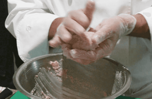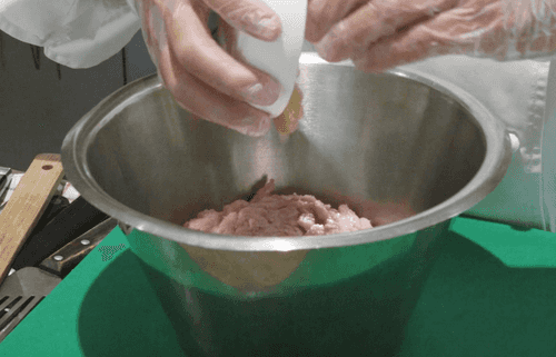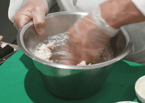 Хорошо перемешать руками фарш, с силой отбивая о стенки миски. Он должен стать очень нежным и насытиться воздухом. Готовый фарш накрыть пленкой и убрать в холодильник на 1 час.