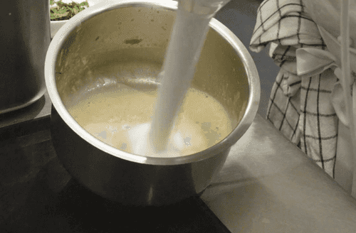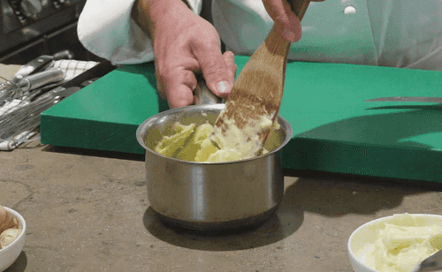 Добавить в картофель подогретое молоко и перемешать лопаткой.