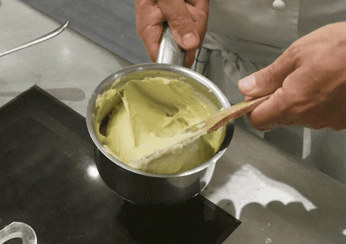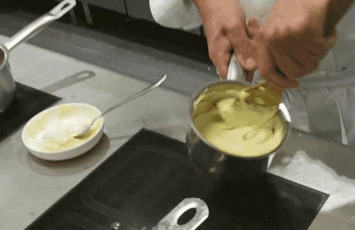 Понемногу, интенсивно работая лопаткой, начать вмешивать размягченное сливочное масло.