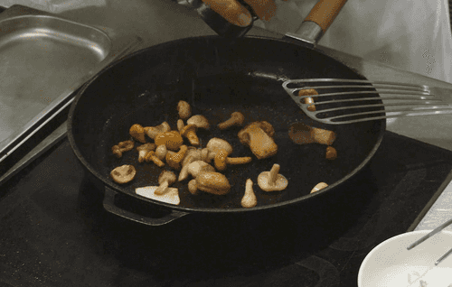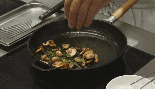 Выложить мелконарезанные шалот и белые грибы, добавить оливкового масла, посолить и поперчить. Жарить, помешивая, около 1 минуты, чтобы грибы дали сок.
