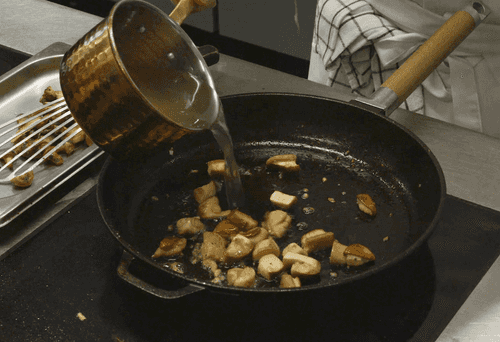 Влить в сковороду бульон, дать закипеть и выпаривать 2–3 минуты на большом огне.