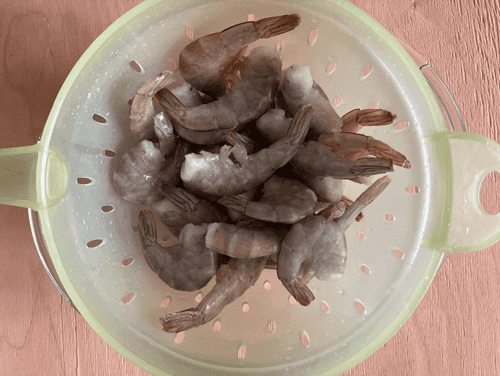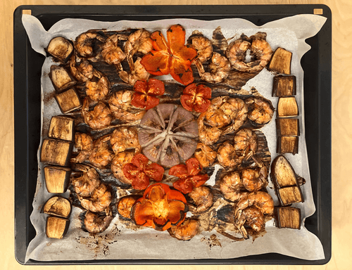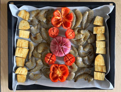 Выложить креветки с овощами на противень, смазать острым соусом и поставить в предварительно разогретую до 200 градусов духовку.