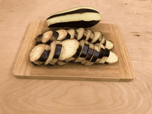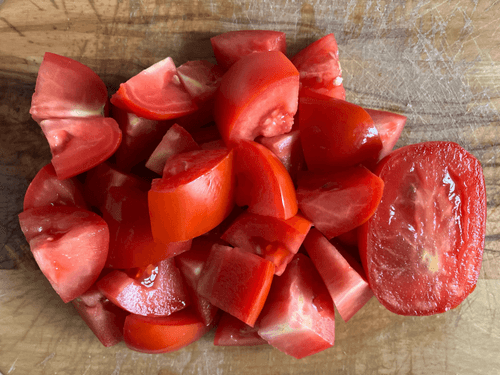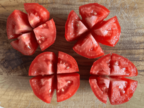 Помыть и разрезать поперек 4 помидора. Сделать нужно несколько надрезов, не прорезая стенки полностью.