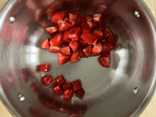 Сложить томаты и перец в кастрюлю, добавить соль, специи, воду. Томить на медленном огне 15 минут.