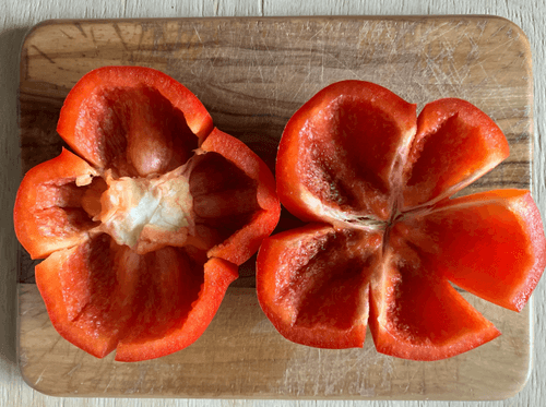 Красный перец помыть, очистить от семян, разрезать поперек. Сделать несколько надрезов, не прорезая стенки полностью.