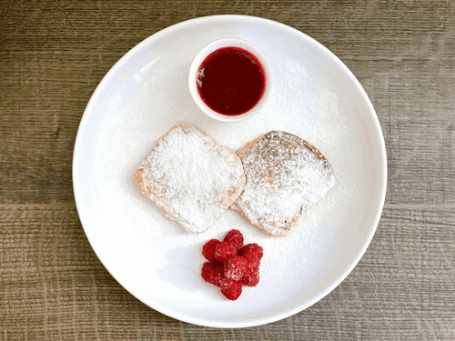 Творожники достать из духовки и остудить. Подавать с малиновым соусом. При подаче украсить ягодами и сахарной пудрой.
