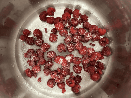 Малину и оставшуюся половину стакана белого сахара поместить в кастрюлю. Добавить воды.