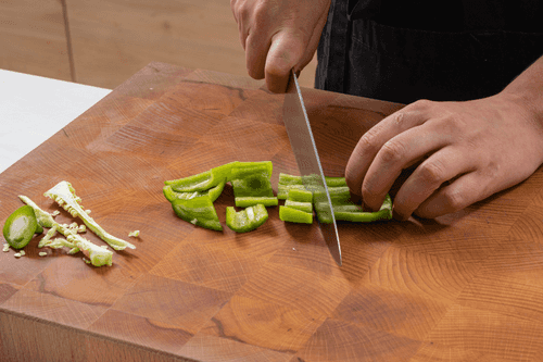 Зеленый перец очистить от семян и произвольно нарезать.