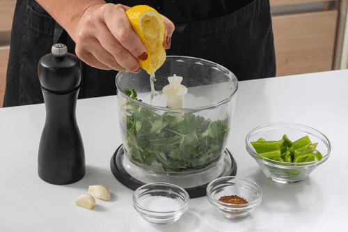 Добавить в блендер зеленый перец, чеснок, лимонный сок и специи. Перемолоть в грубую кашу.