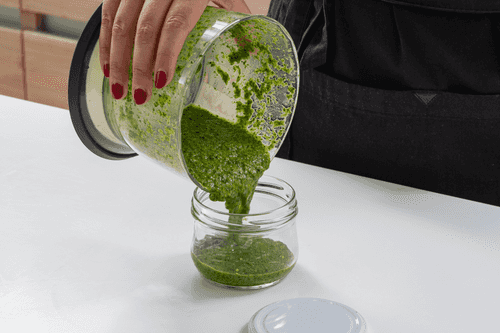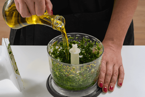 Продолжать перемалывать, потихоньку вливая оливковое масло. Много не лить: смесь должна быть достаточно густой.