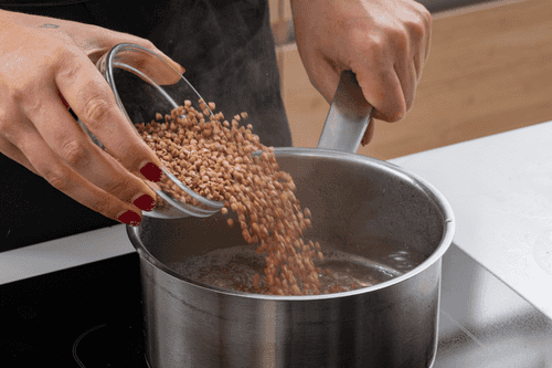 Крупу всыпать в воду. Довести до кипения и убавить огонь до среднего.