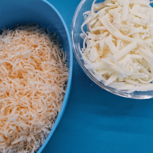 Моцареллу натереть на крупной терке, твердый сыр — на мелкой.