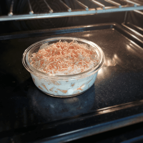 Сверху распределить твердый сыр и приправить чили-порошком.