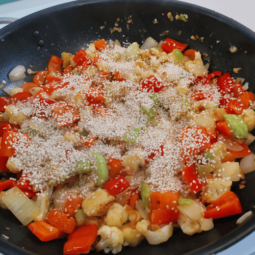 Через 3 минуты добавить кунжут и перемешать. Убавить огонь.