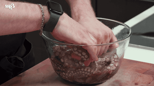 Подготовить все ингредиенты. Осьминога положить в большую миску, налить немного оливкового масла, добавить крупную соль и хорошо промассировать всю тушку. Массаж должен занять от 20 до 40 минут, это нужно для того, чтобы осьминог был мягким. Промыть осьминога после массажа.