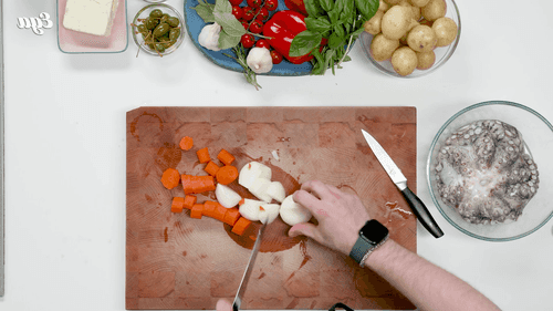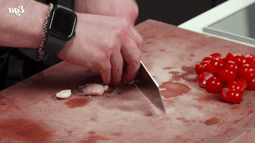 Черри разрезать пополам. 2 зубчика чеснока нарезать очень мелко. Базилик произвольно порубить.