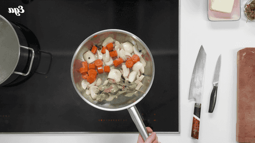 На сковороде разогреть растительное масло, бросить на нее душистый перец, лавровые листья, морковь и лук. Обжарить до золотистого цвета в течение 3–4 минут.