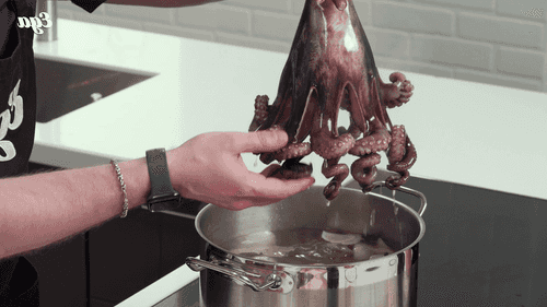 Взять осьминога за голову, опустить его на несколько секунд в кипящий бульон, затем поднять, повторить это несколько раз. Это нужно для того, чтобы щупальца красиво закрутились.