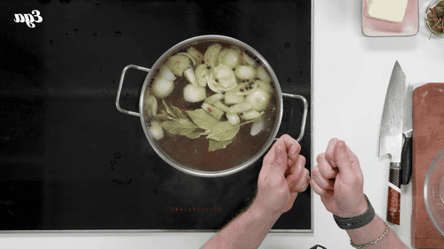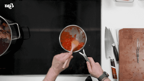 Добавить 40 грамм сливочного масла и 100 мл бульона от осьминога. Перемешать до состояния эмульсии.