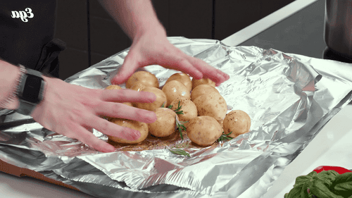 Пока осьминог варится, подготовить гарнир. На несколько слоев фольги положить картофель, полить оливковым маслом, посыпать солью, добавить розмарин и завернуть. Отправить в духовку, разогретую до 200 градусов, на 1 час.