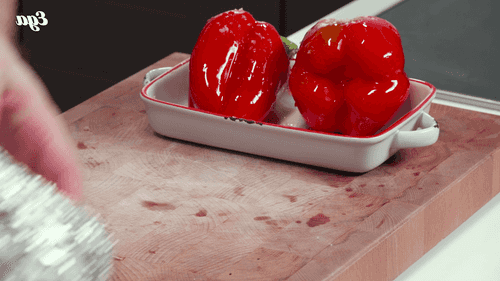 Перец полить оливковым маслом, немного посолить и тоже убрать в духовку на 20 минут.