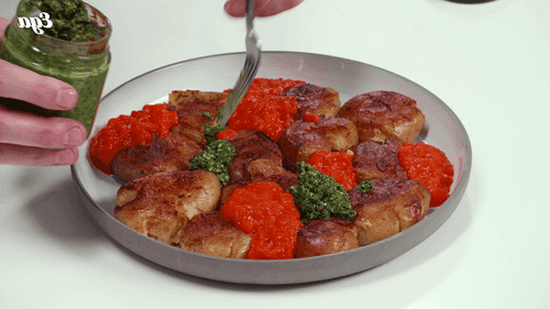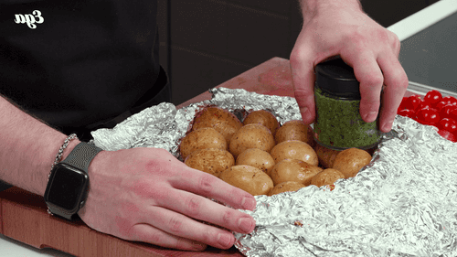 Картофель достать из духовки и плоским дном стакана или банки немного его примять.
