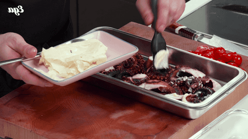 Готового осьминога разделать на щупальца, выложить на противень, посолить по вкусу, смазать их размягченным сливочным маслом и поставить в духовку на 10 минут при тех же 200 градусах. Голову осьминога можно также запечь вместе со щупальцами или заморозить, чтобы потом добавить ее, например, в рыбный суп.