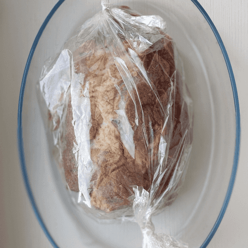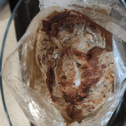 За 20 минут до окончания достать из духовки, раскрыть рукав и убрать мясо обратно для образования румяной корочки.