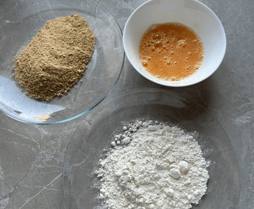 Яйцо перемешать, пересыпать муку и панировочные сухари на тарелки.