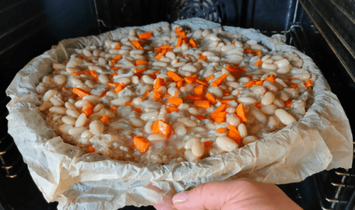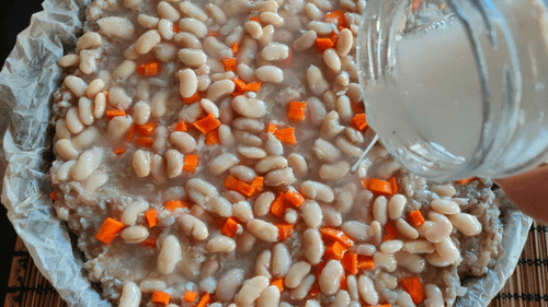 Выложить сверху немного моркови, фасоль и залить соусом из банки, все равномерно распределить.