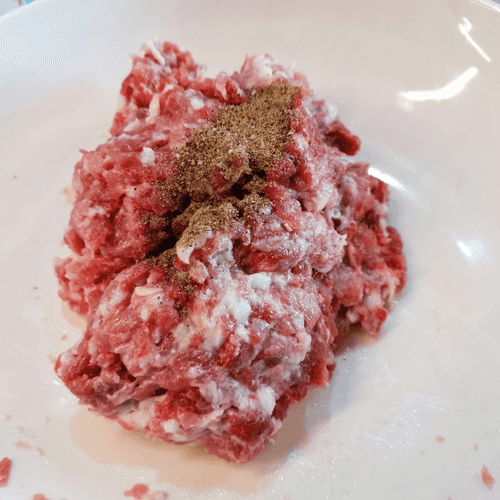 Прокрутить мясо и сало через мясорубку.