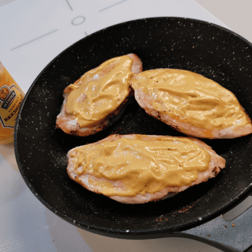 Смазать сверху дижонской горчицей и убавить огонь до среднего.