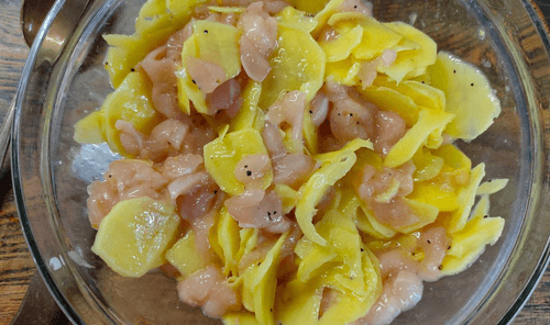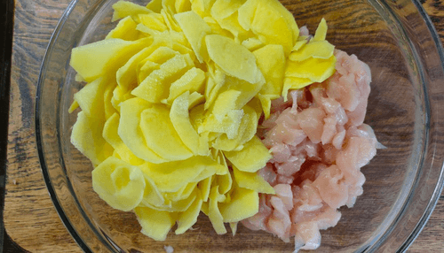 Куриную грудку мелко нарезать, картофель очистить.