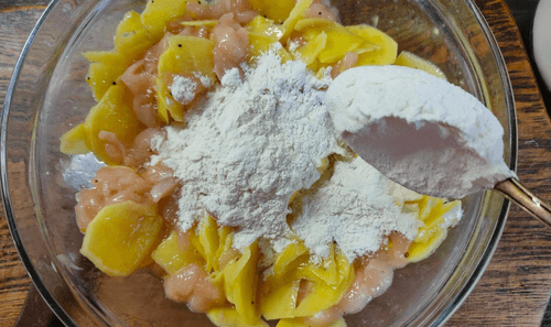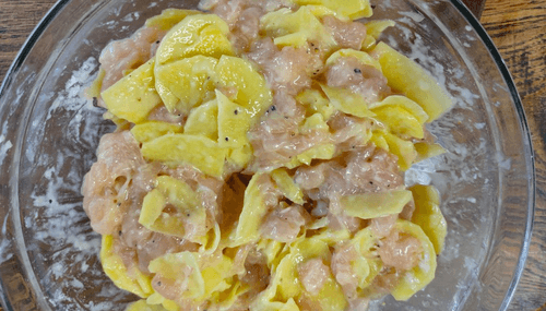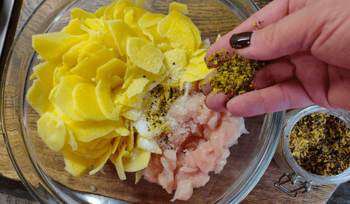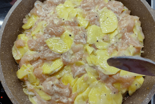 Добавить картофель к курице.