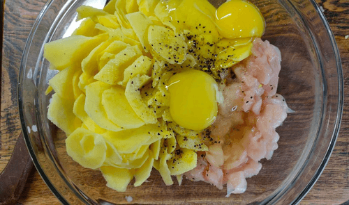 Выложить на горячую сковороду с маслом половину картофельно-куриной смеси.