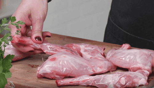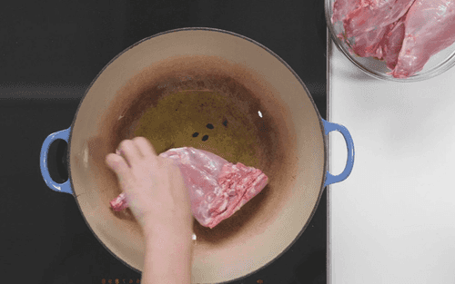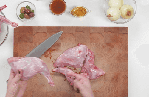 В большой толстостенной кастрюле разогреть оставшееся оливковое масло и порциями обжарить ножки кролика до золотистой корочки.