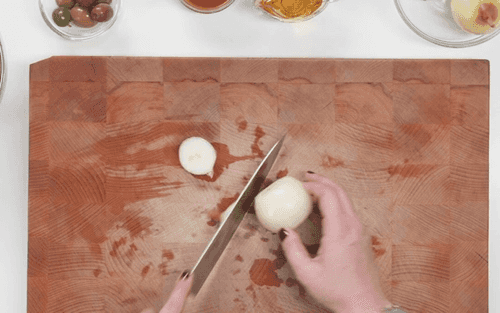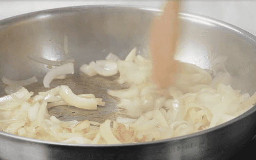 Разогреть сковороду с оливковым маслом и обжарить лук до карамельно-золотистого цвета.