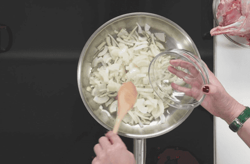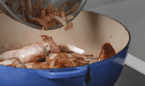 Когда все лапки обжарятся, вернуть их все в кастрюлю, добавить к ним лук из сковороды.