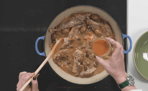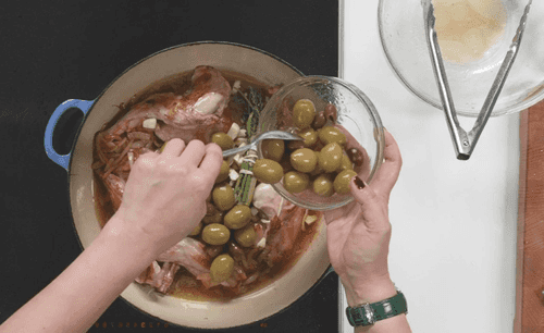 Залить все вином, водой и 100 мл маринада от оливок, немного посолить, добавить черный и белый перец, накрыть крышкой и тушить на огне ниже среднего от 40 минут до полутора часов, в зависимости от качества мяса.