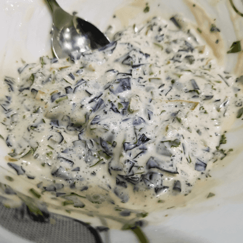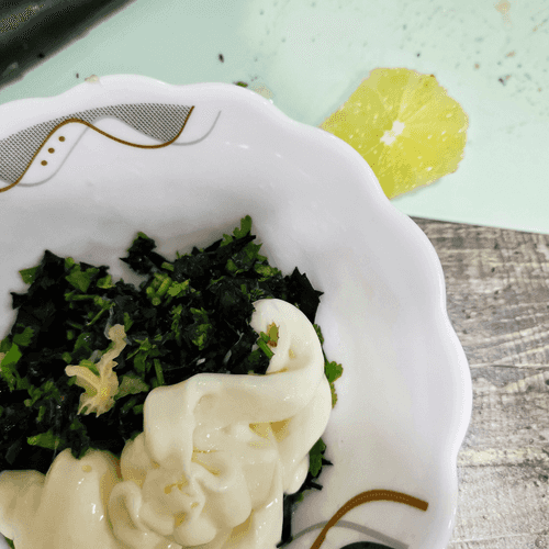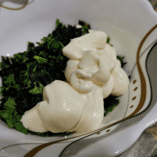 Смешать мелко нарубленный базилик и майонез в глубокой миске.